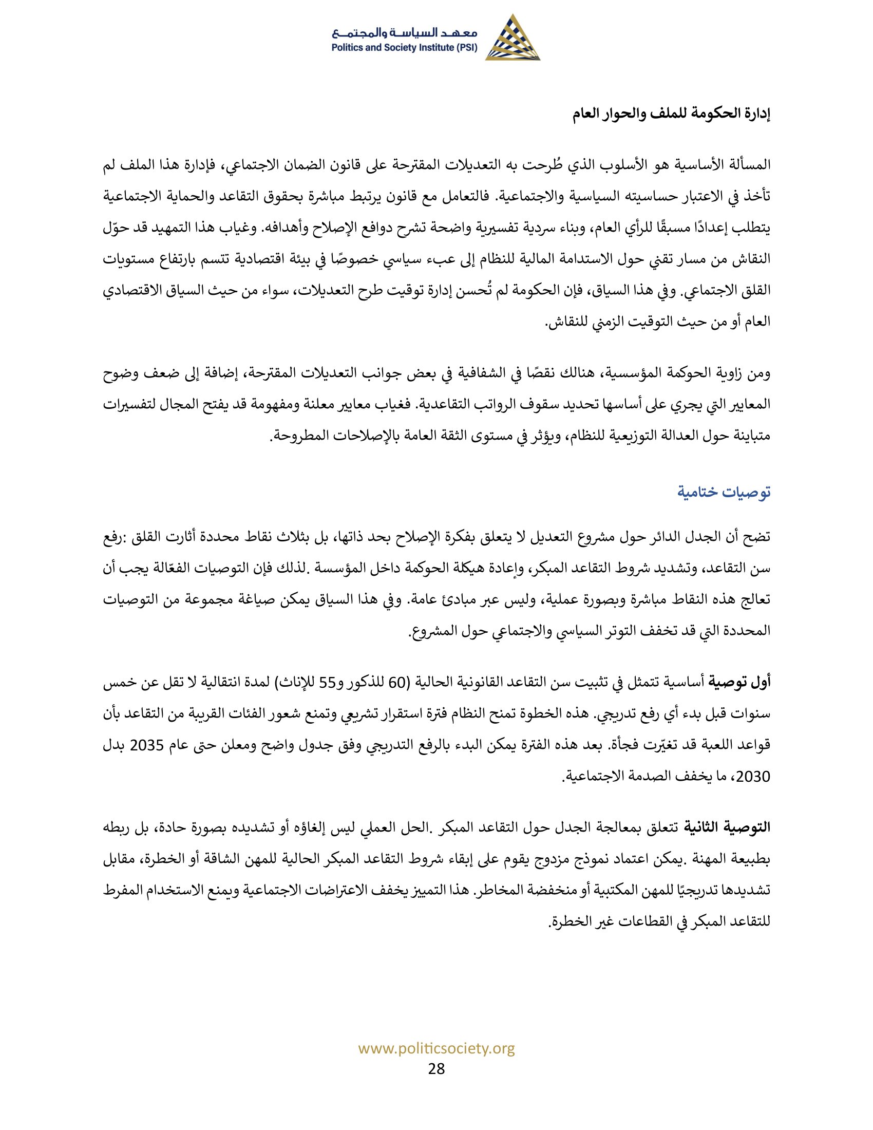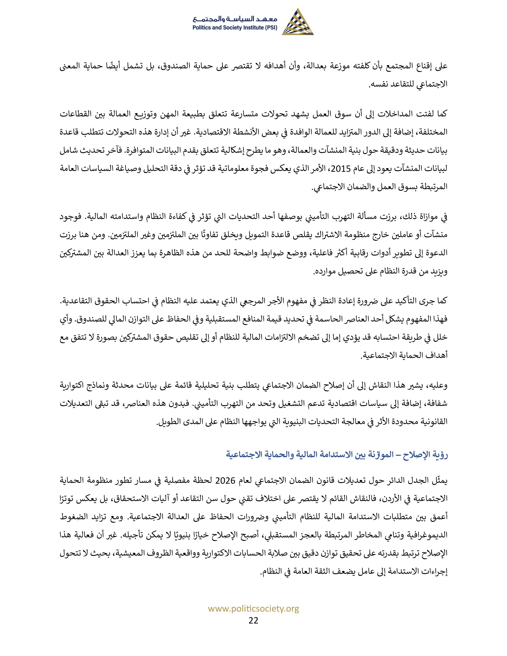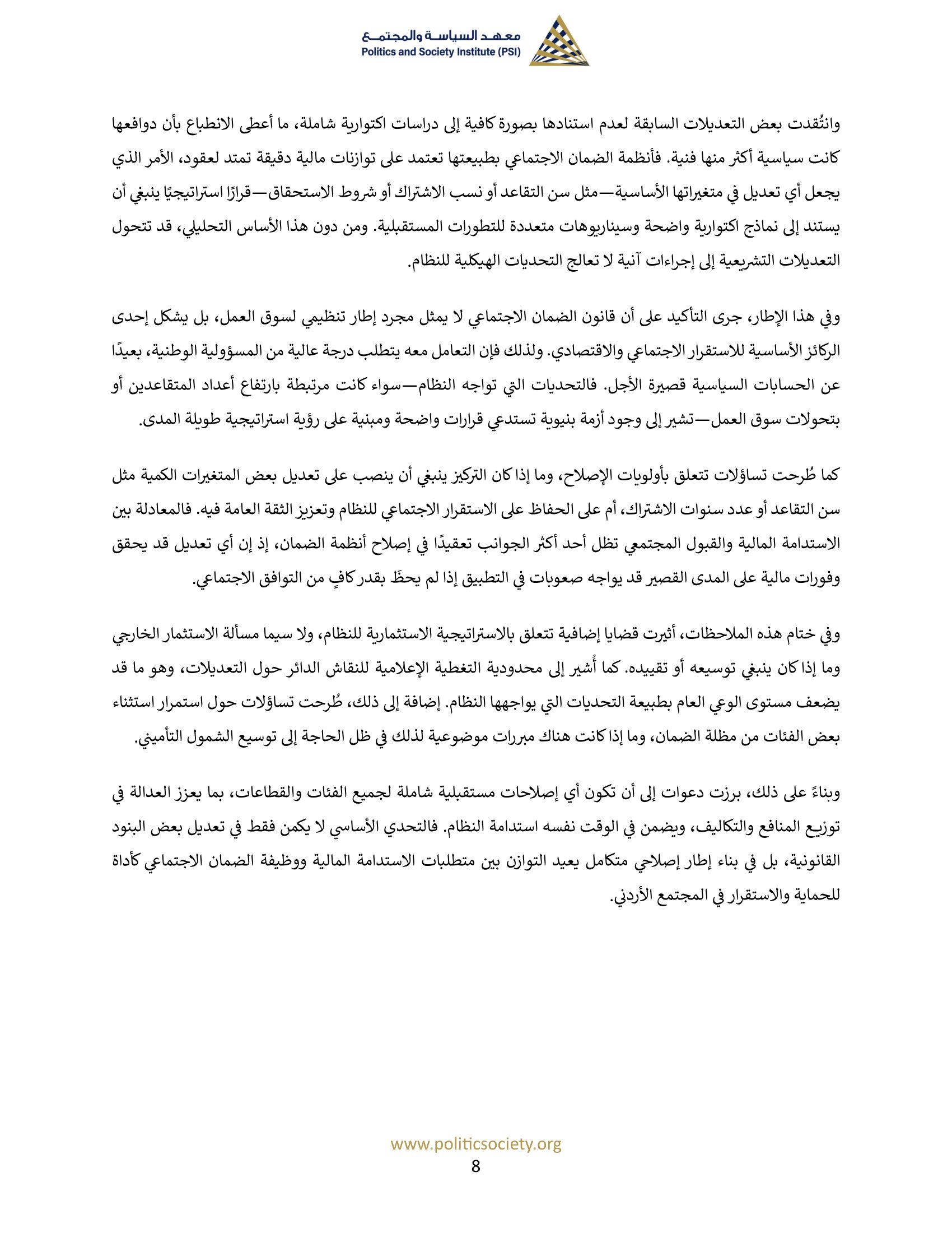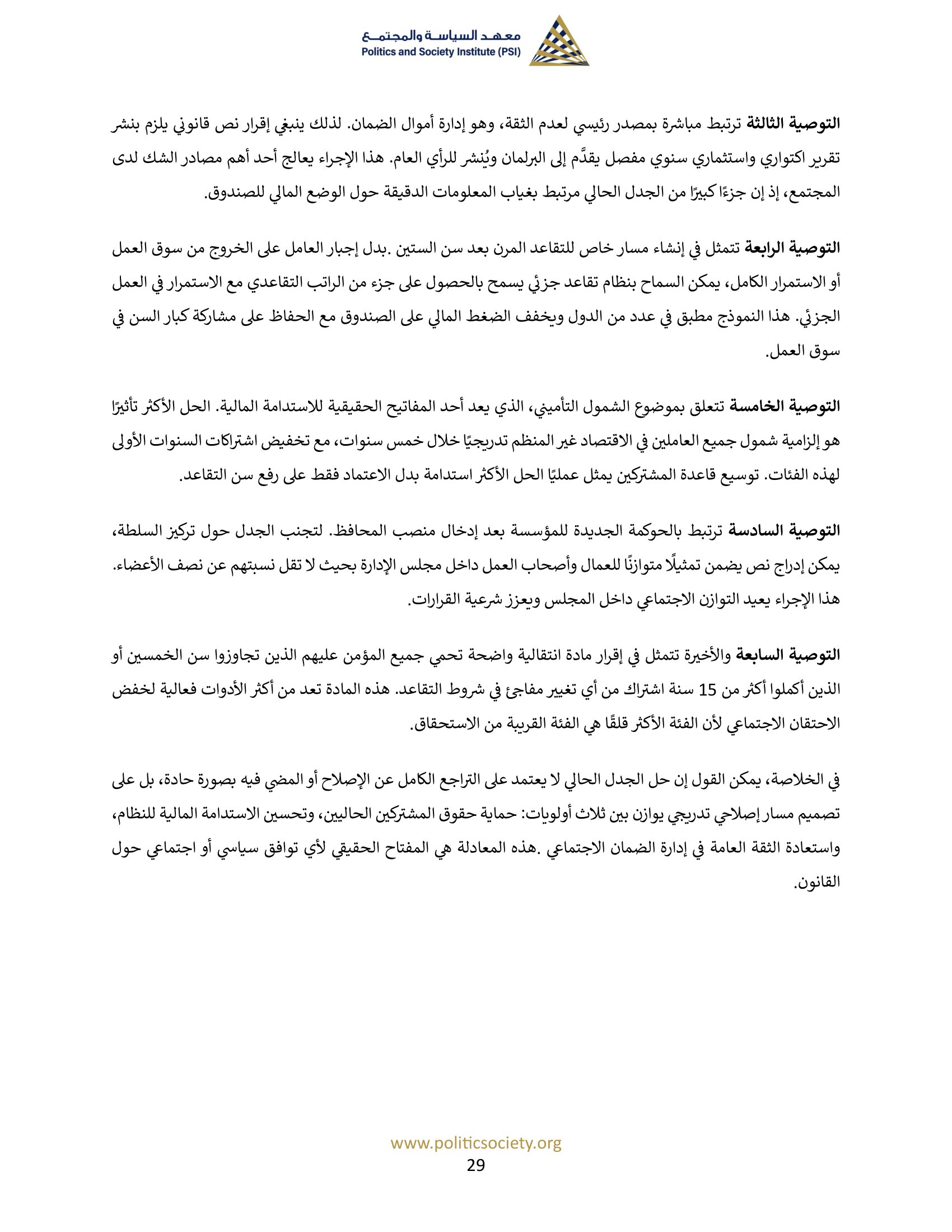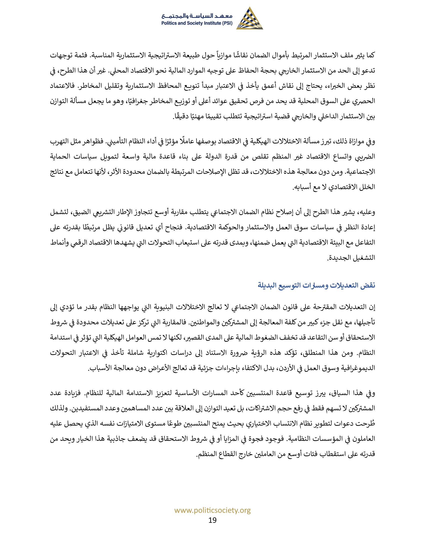 ويخلص التقرير إلى مجموعة من التوصيات، أبرزها ضرورة تبنّي مقاربة إصلاحية شاملة تعالج الاختلالات البنيوية للنظام، وتحقيق توازن بين الاستدامة المالية والحماية الاجتماعية، وتعزيز الثقة العامة من خلال وضوح السياسات واستقرارها. كما يدعو إلى ربط إصلاحات الضمان بسياسات سوق العمل، وتوسيع الشمول التأميني، وتعزيز الحوكمة وكفاءة إدارة الاستثمارات، بما يدعم استدامة النظام على المدى الطويل.
