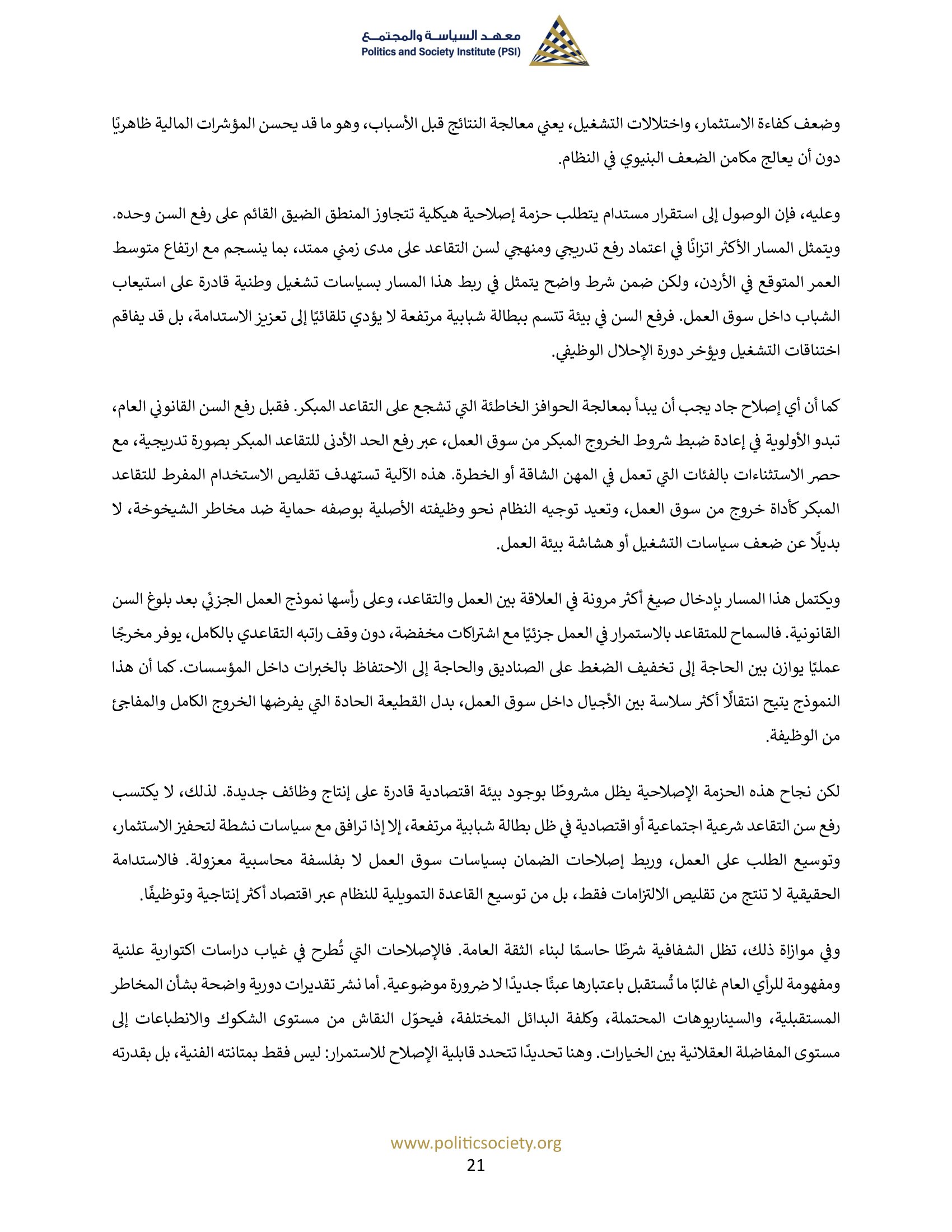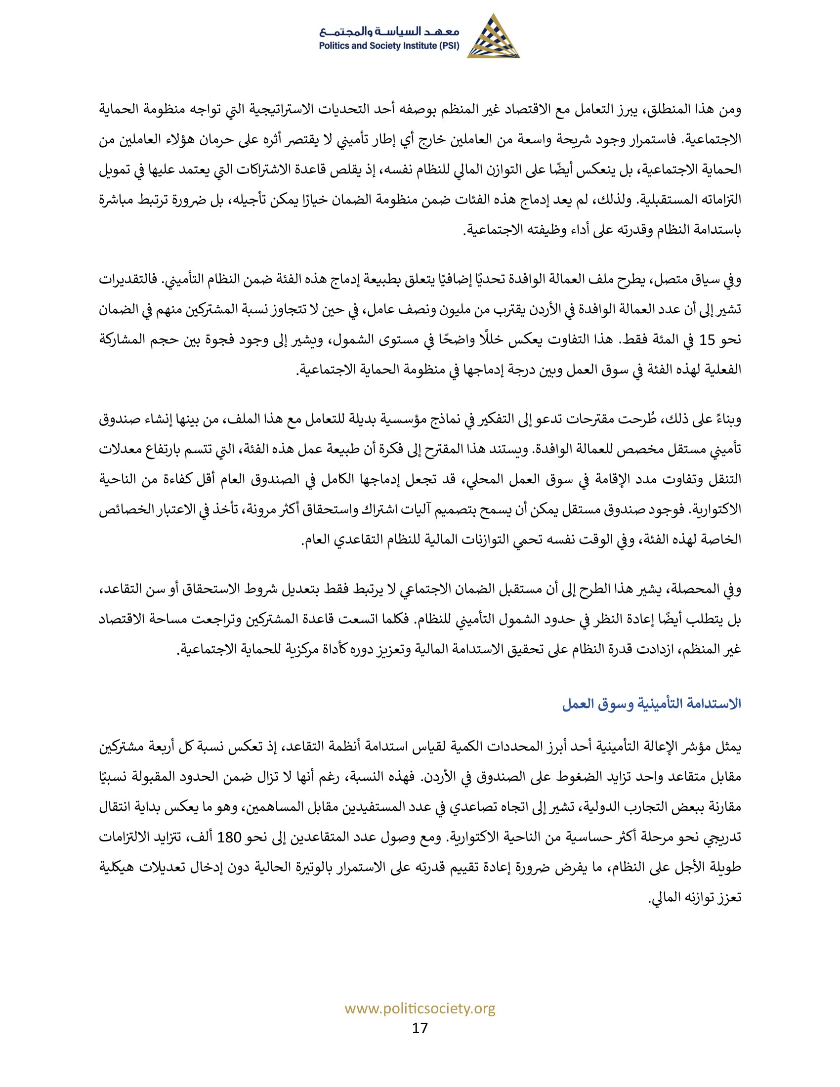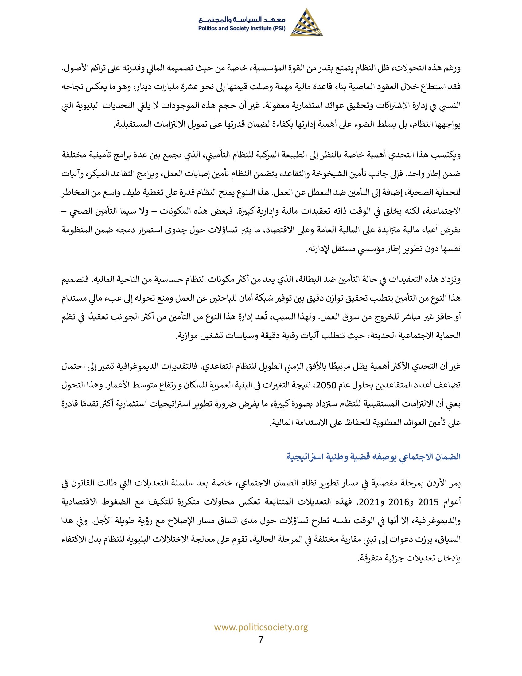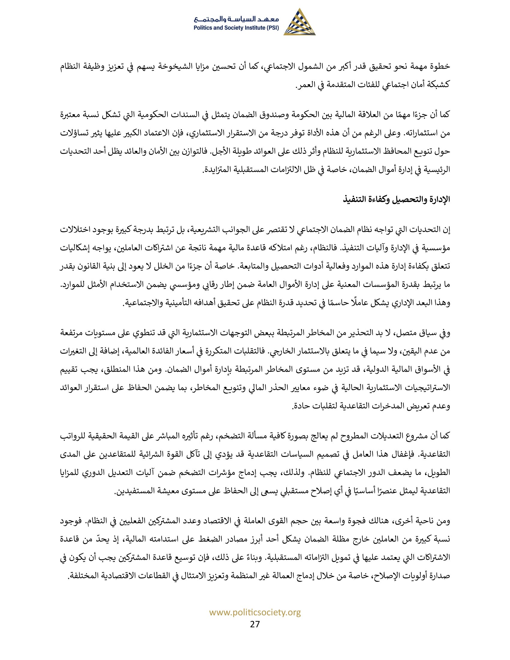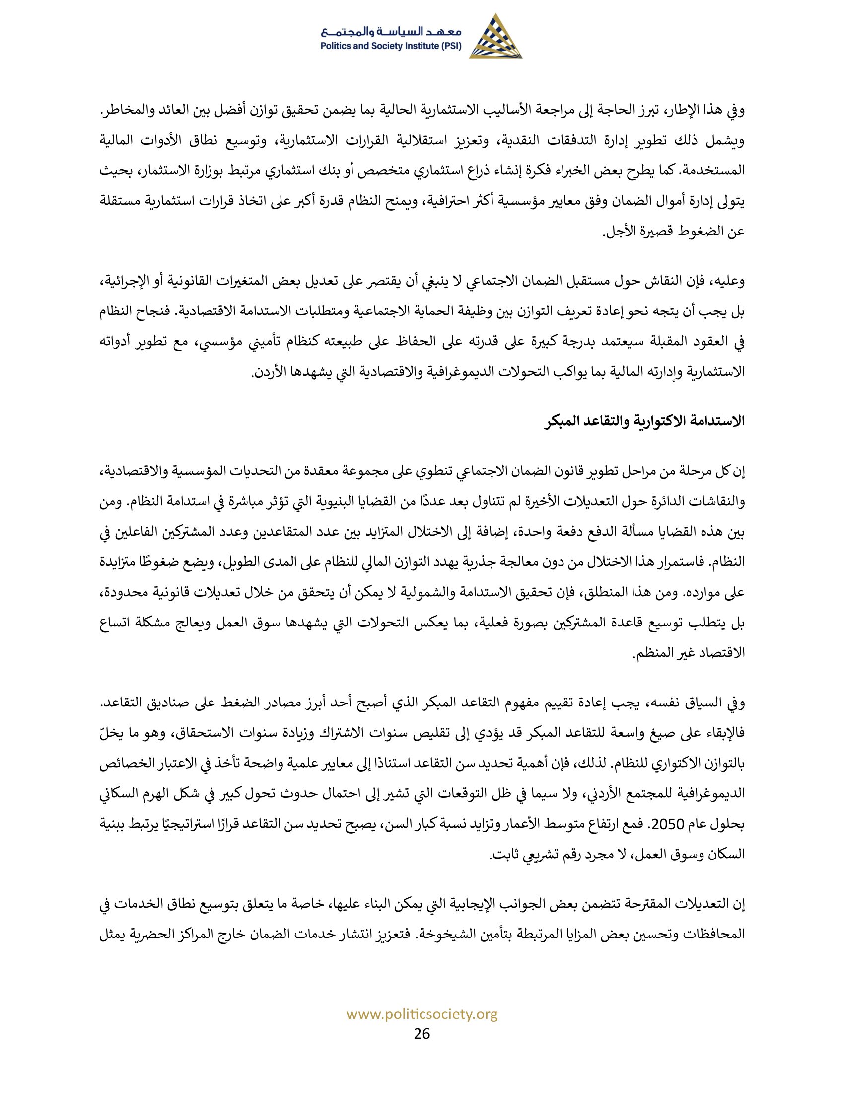 ويخلص التقرير إلى مجموعة من التوصيات، أبرزها ضرورة تبنّي مقاربة إصلاحية شاملة تعالج الاختلالات البنيوية للنظام، وتحقيق توازن بين الاستدامة المالية والحماية الاجتماعية، وتعزيز الثقة العامة من خلال وضوح السياسات واستقرارها. كما يدعو إلى ربط إصلاحات الضمان بسياسات سوق العمل، وتوسيع الشمول التأميني، وتعزيز الحوكمة وكفاءة إدارة الاستثمارات، بما يدعم استدامة النظام على المدى الطويل.
