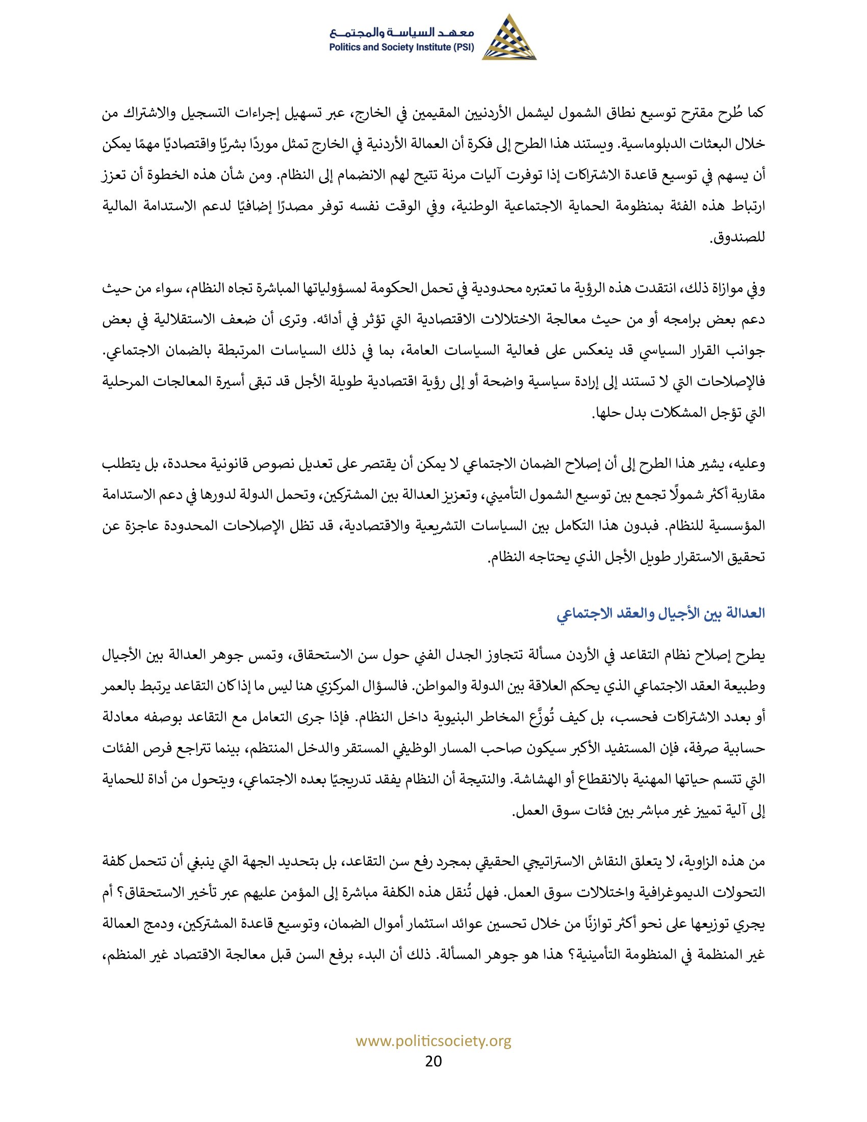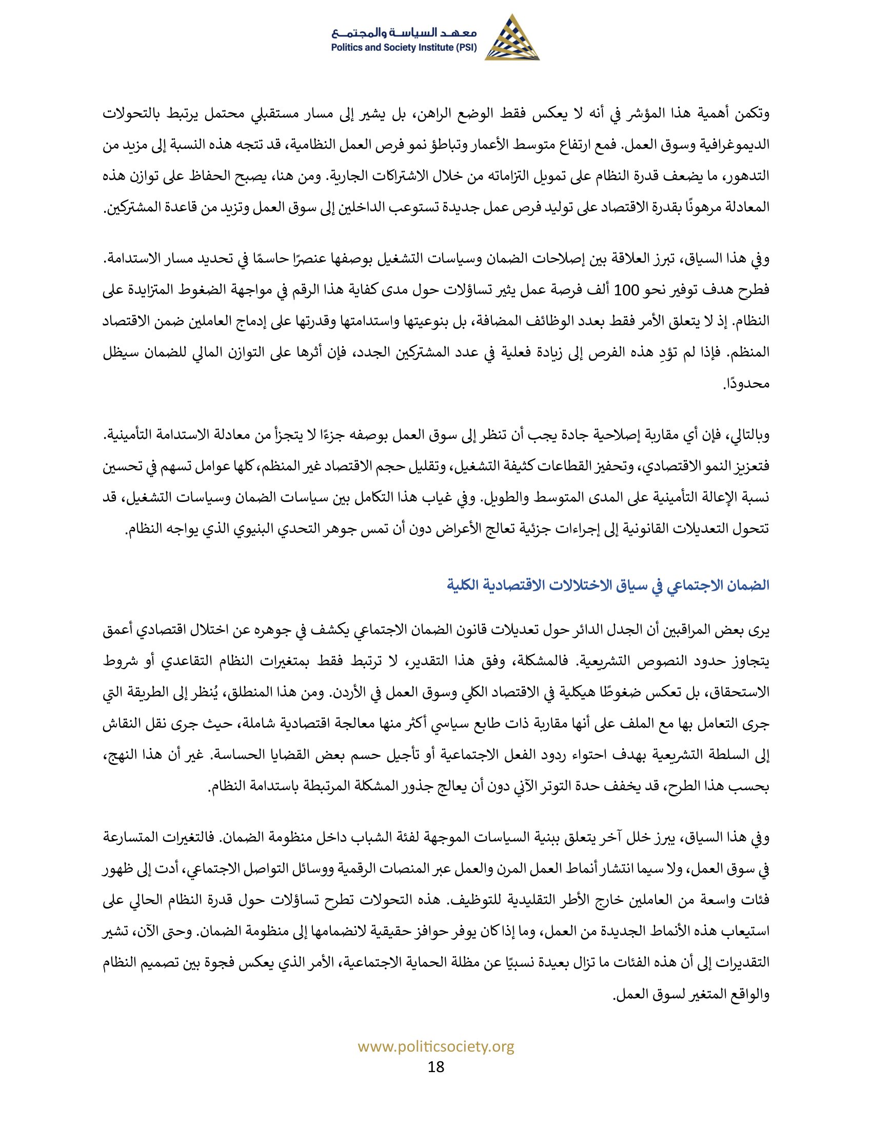 ويشير التقرير إلى أن ملف الضمان الاجتماعي في الأردن يشهد مرحلة دقيقة تتجاوز حدود النقاش التشريعي التقليدي، إذ انتقل الجدل من مستوى البنود القانونية إلى مستوى أعمق يتعلق بطبيعة العقد الاجتماعي بين الدولة والمجتمع، وبكيفية توزيع المخاطر الاقتصادية بين الأجيال المختلفة، في ظل تحولات ديموغرافية وارتفاع متوسط الأعمار وتغير أنماط التشغيل في سوق العمل.