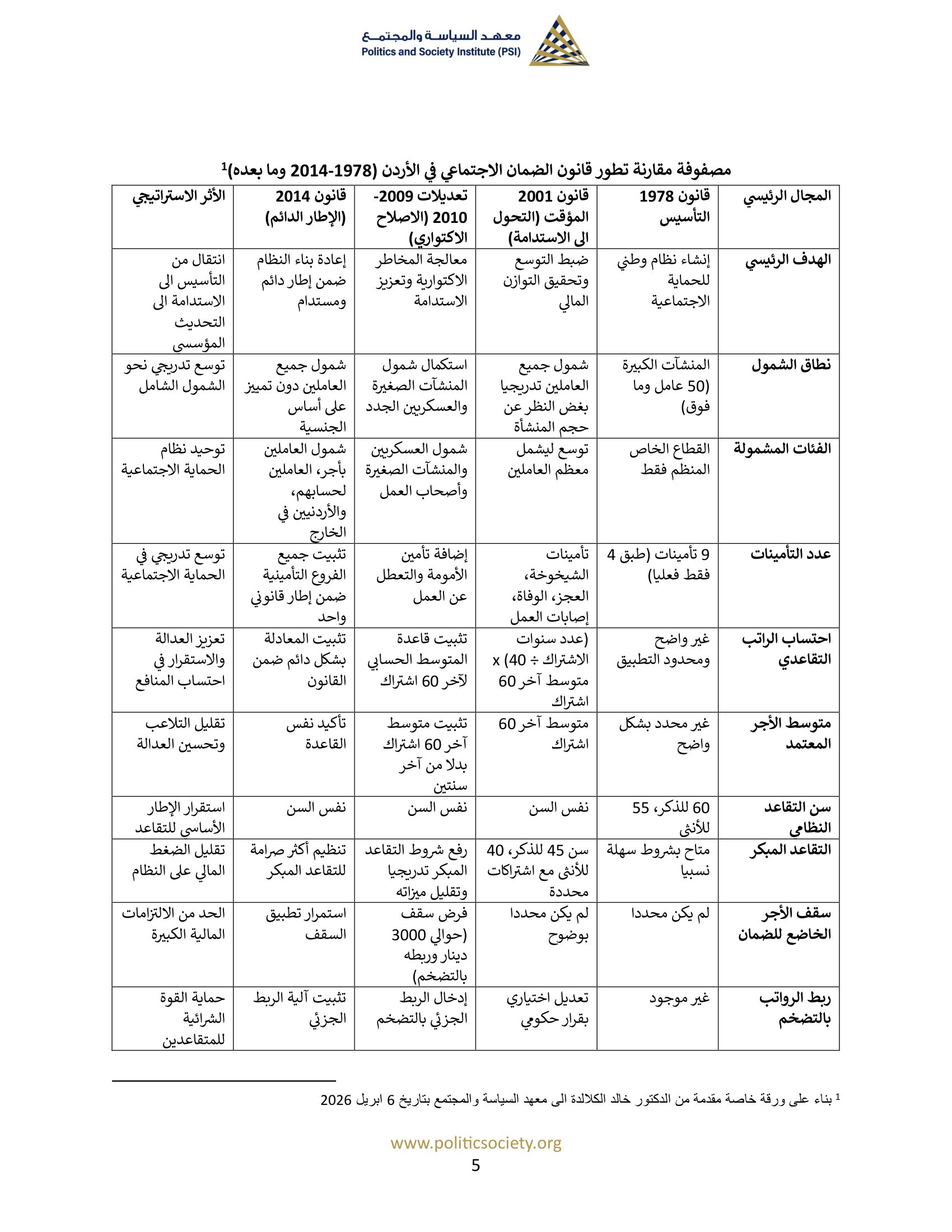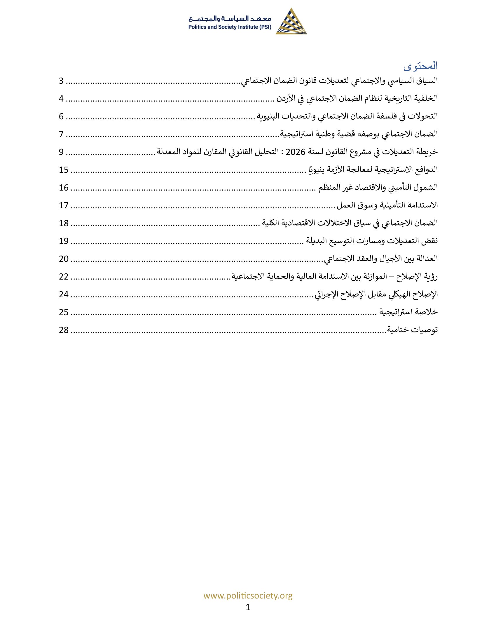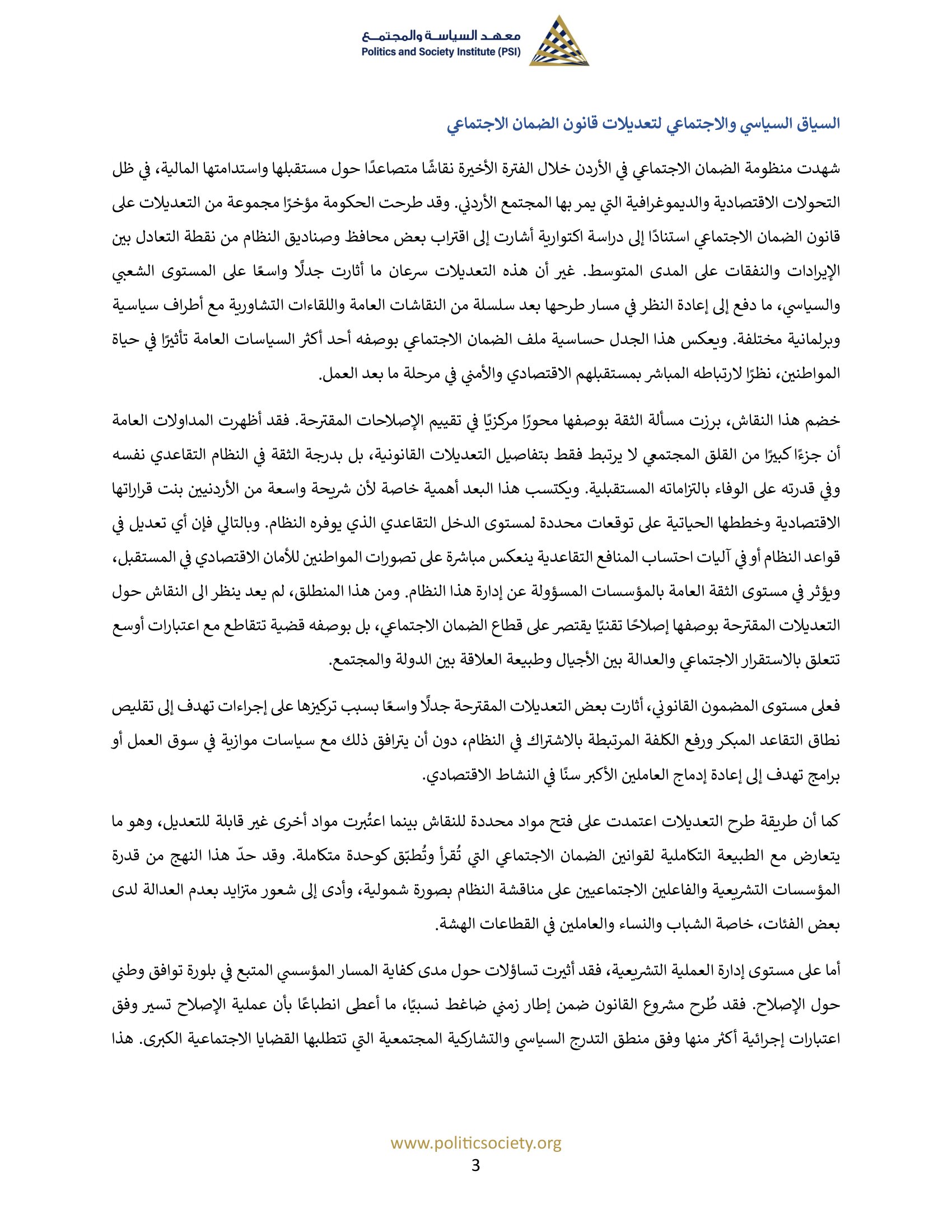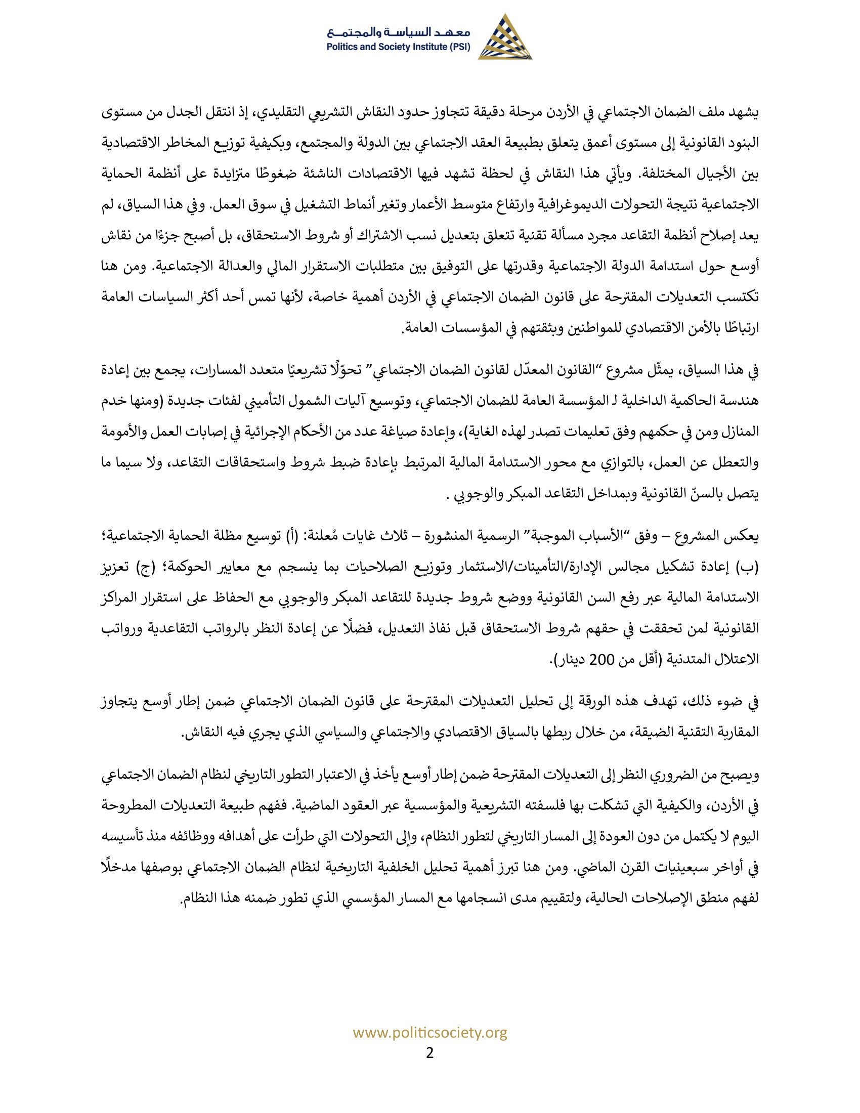 عمون - أصدر معهد السياسة والمجتمع تقريرًا تحليليًا بعنوان: “إشارات حول مشروع قانون الضمان الاجتماعي قبل التعديل”، تناول فيه التعديلات المقترحة على قانون الضمان الاجتماعي لعام 2026، ضمن قراءة تربط بين الأبعاد القانونية والاقتصادية والاجتماعية للنظام، وفي سياق النقاش الوطني المتصاعد حول مستقبله واستدامته.