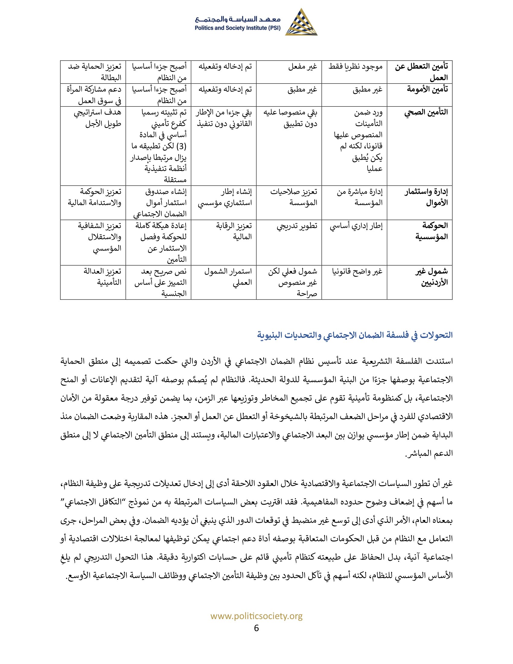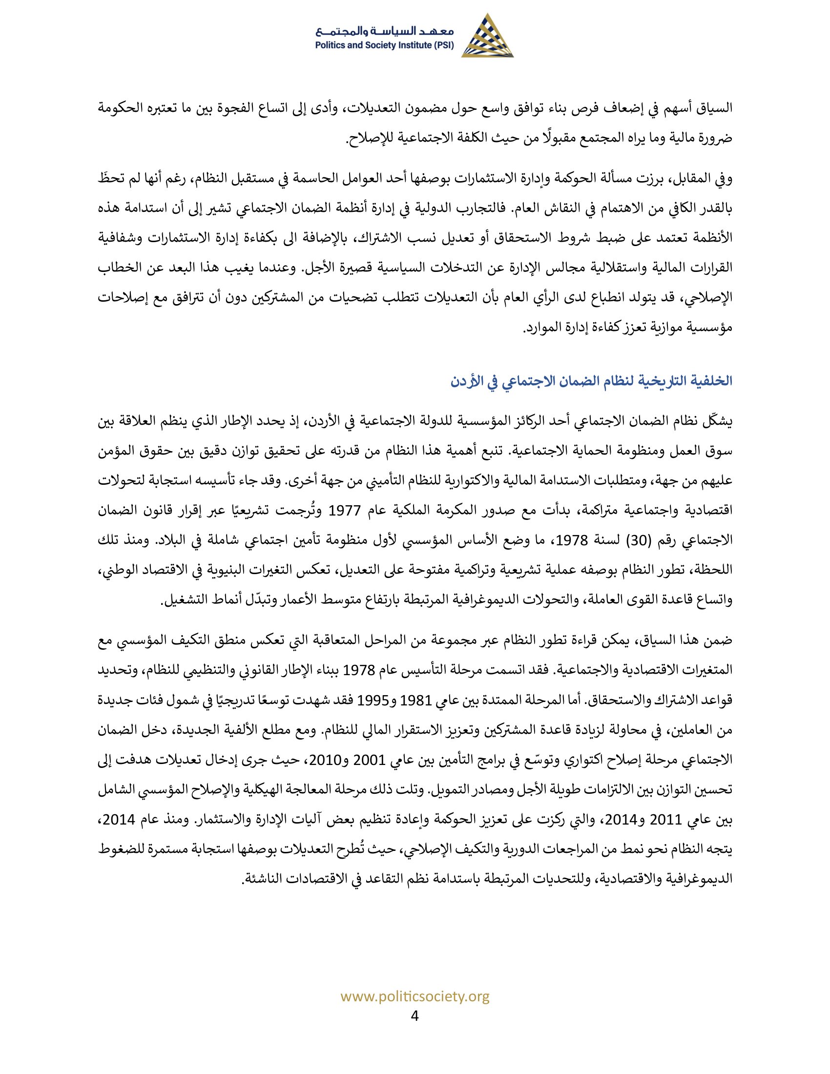 وفي قراءته للتحولات البنيوية للنظام، يستعرض التقرير المسار التاريخي لتطور الضمان الاجتماعي في الأردن منذ تأسيسه عام 1978، مرورًا بمراحل التوسع والإصلاح الاكتواري والمعالجة الهيكلية، وصولًا إلى مرحلة المراجعات الدورية، مشيرًا إلى أن النظام تطوّر بوصفه عملية تشريعية تراكمية تعكس التغيرات في الاقتصاد الوطني واتساع قاعدة القوى العاملة والتحولات الديموغرافية.