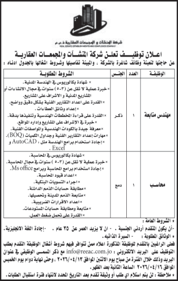 وظائف شاغرة لدى شركة المنشآت والمجمعات العقارية