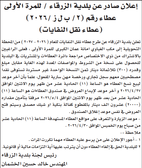عطاء نقل نفايات / بلدية الزرقاء