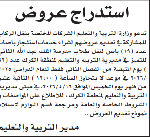 عطاء شراء خدمات استئجار باصات لنقل طلاب مدرسة الملك عبدالله الثاني للتميز