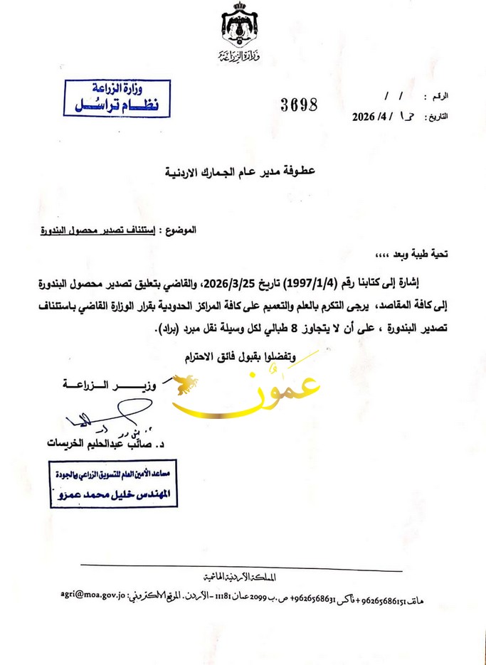 عمون - ينال المعاني - قرر وزير الزراعة الدكتور صائب خريسات استئناف تصدير محصول البندورة. |