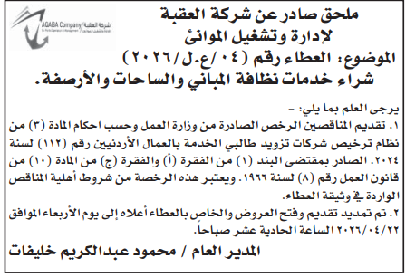 عطاء صادر عن شركة العقبة لادارة وتشغيل الموانئ
