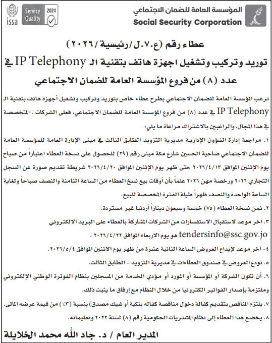 عطاء صادر عن المؤسسة العامة للضمان الاجتماعي
