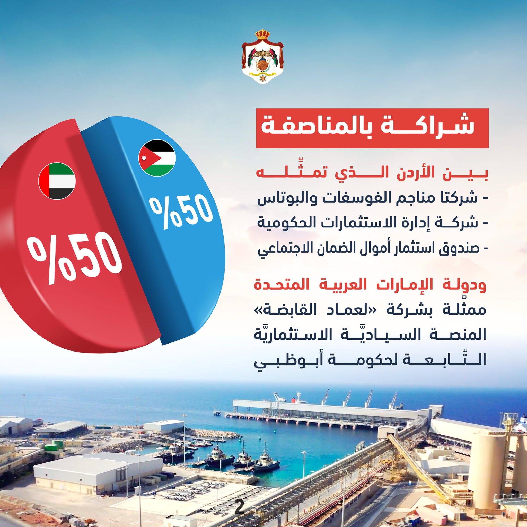 ويأتي المشروع في إطار شراكة بالمناصفة بين الأردن ودولة الإمارات العربية المتحدة؛ إذ يمثل الجانب الأردني كل من شركتي مناجم الفوسفات والبوتاس، وشركة إدارة الاستثمارات الحكومية، وصندوق استثمار أموال الضمان الاجتماعي، فيما تمثل الجانب الإماراتي شركة "عماد القابضة" والمنصة السيادية الاستثمارية التابعة لحكومة أبوظبي.