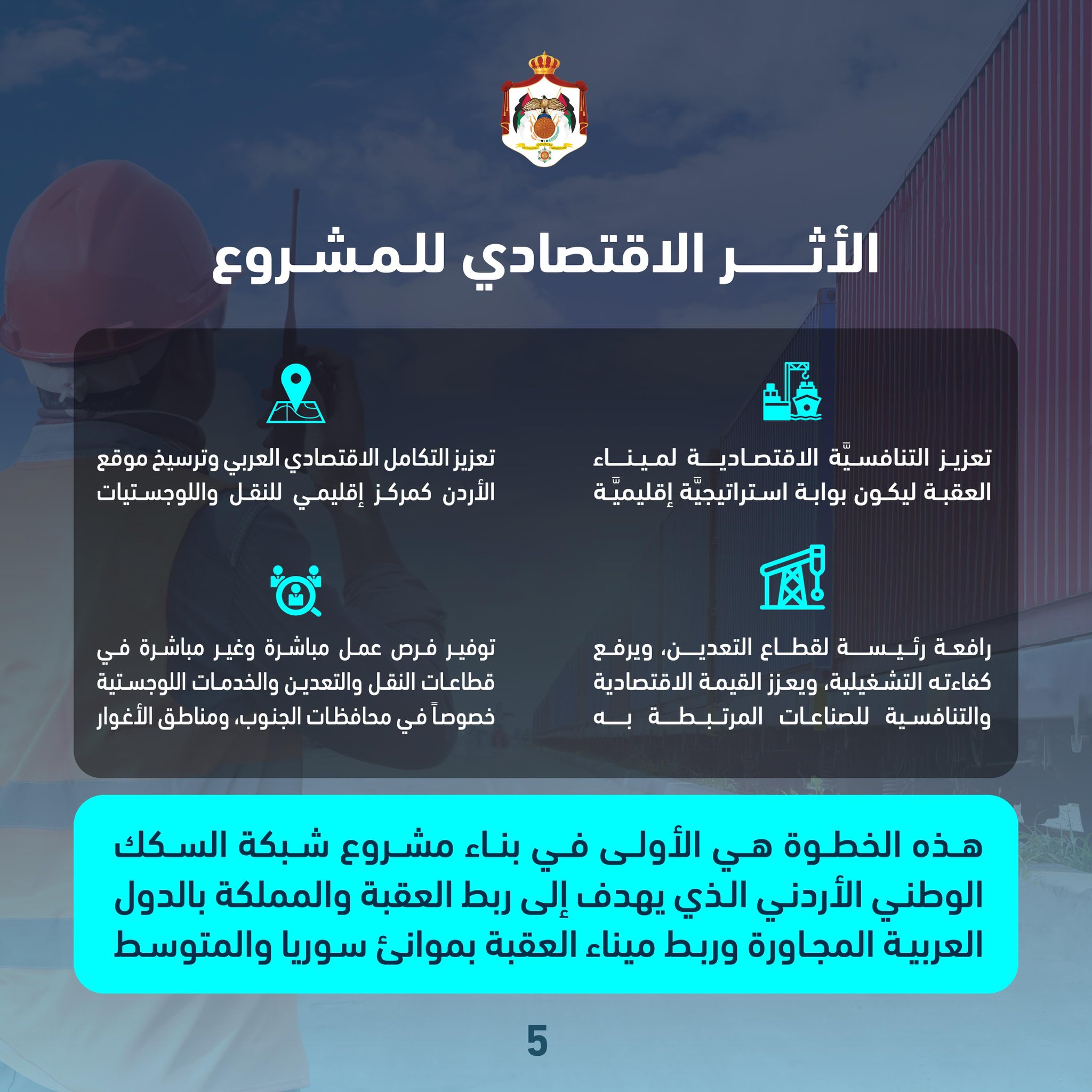 كما يشكل المشروع رافعة رئيسة لقطاع التعدين، من خلال رفع كفاءته التشغيلية وتعزيز القيمة الاقتصادية والتنافسية للصناعات المرتبطة به، إضافة إلى توفير فرص عمل مباشرة وغير مباشرة في قطاعات النقل والتعدين والخدمات اللوجستية، لا سيما في محافظات الجنوب ومناطق الأغوار.