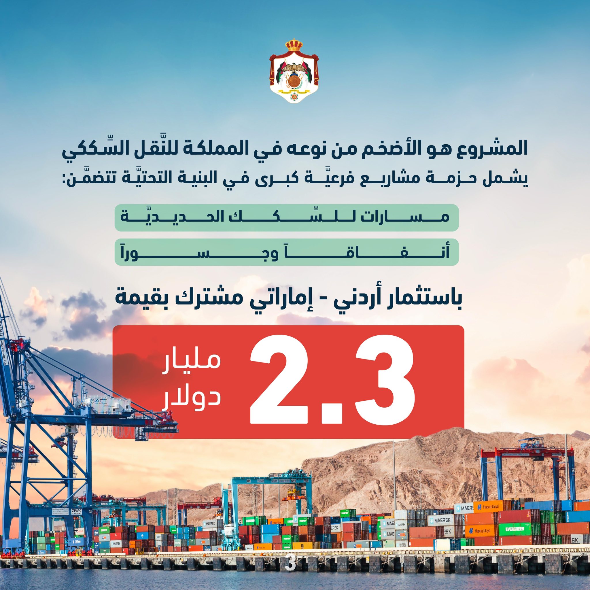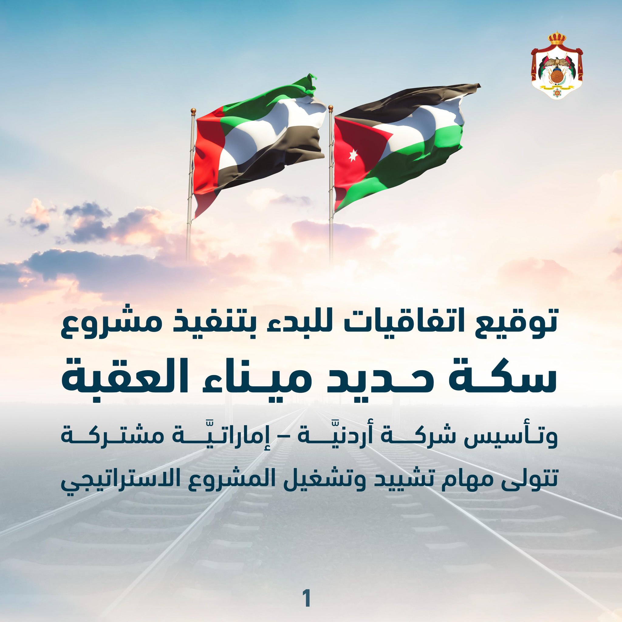 عمون - شهد رئيس الوزراء جعفر حسَّان وسموّ الشَّيخ منصور بن زايد آل نهيَّان نائب رئيس دولة الإمارات نائب رئيس مجلس الوزراء ورئيس ديوان الرِّئاسة، توقيع الاتفاقيَّات لبدء الإجراءات الفعليَّة لتنفيذ مشروع سكَّة حديد ميناء العقبة، وتأسيس شركة أردنيَّة – إماراتيَّة مشتركة تقوم بمهام تشييد وتشغيل مشروع سكَّة حديد ميناء العقبة.