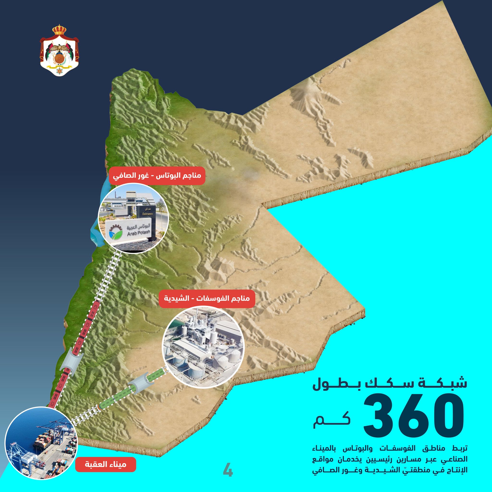 وتمتد شبكة السكك الحديدية بطول 360 كيلومتراً، لربط مناطق إنتاج الفوسفات والبوتاس بالميناء الصناعي في العقبة، عبر مسارين رئيسيين يخدمان مواقع الإنتاج في منطقتي الشيدية وغور الصافي.