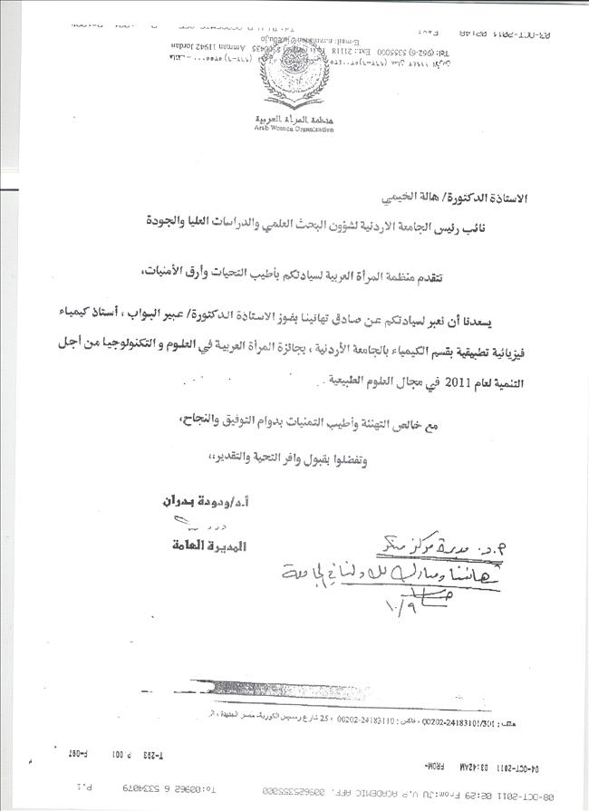 عمون - أعلنت منظمة المرأة العربية أسماء الفائزات بجائزة المرأة العربية في العلوم والتكنولوجيا من أجل التنمية لدورتها الثالثة لعام ٢٠١١م وحصلت الأستاذ الدكتورة عبير البواب استاذة الكيمياء الفيزيائية التطبيقية بقسم الكيمياء بالجامعة الاردنية ومديرة مركز حمدي منكو للبحوث العلمية على الجائزة في مجال العلوم الطبيعية لهذا العام وذلك عن مجمل أعمالها العلمية المنشورة خلال الخمس سنوات السابقة.