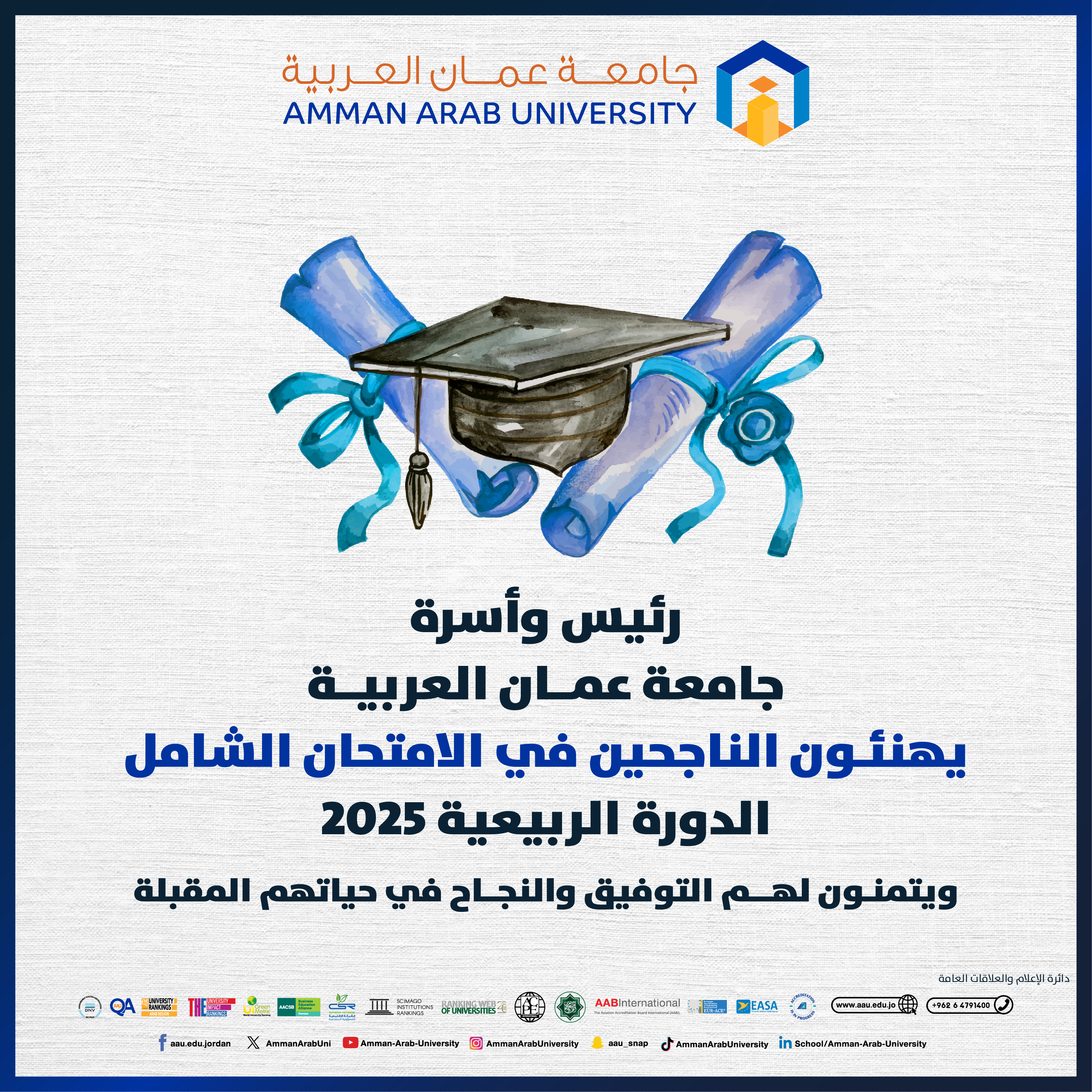 جامعة عمان العربية تهنئ الناجحين في الامتحان الشامل الدورة الربيعية 2025