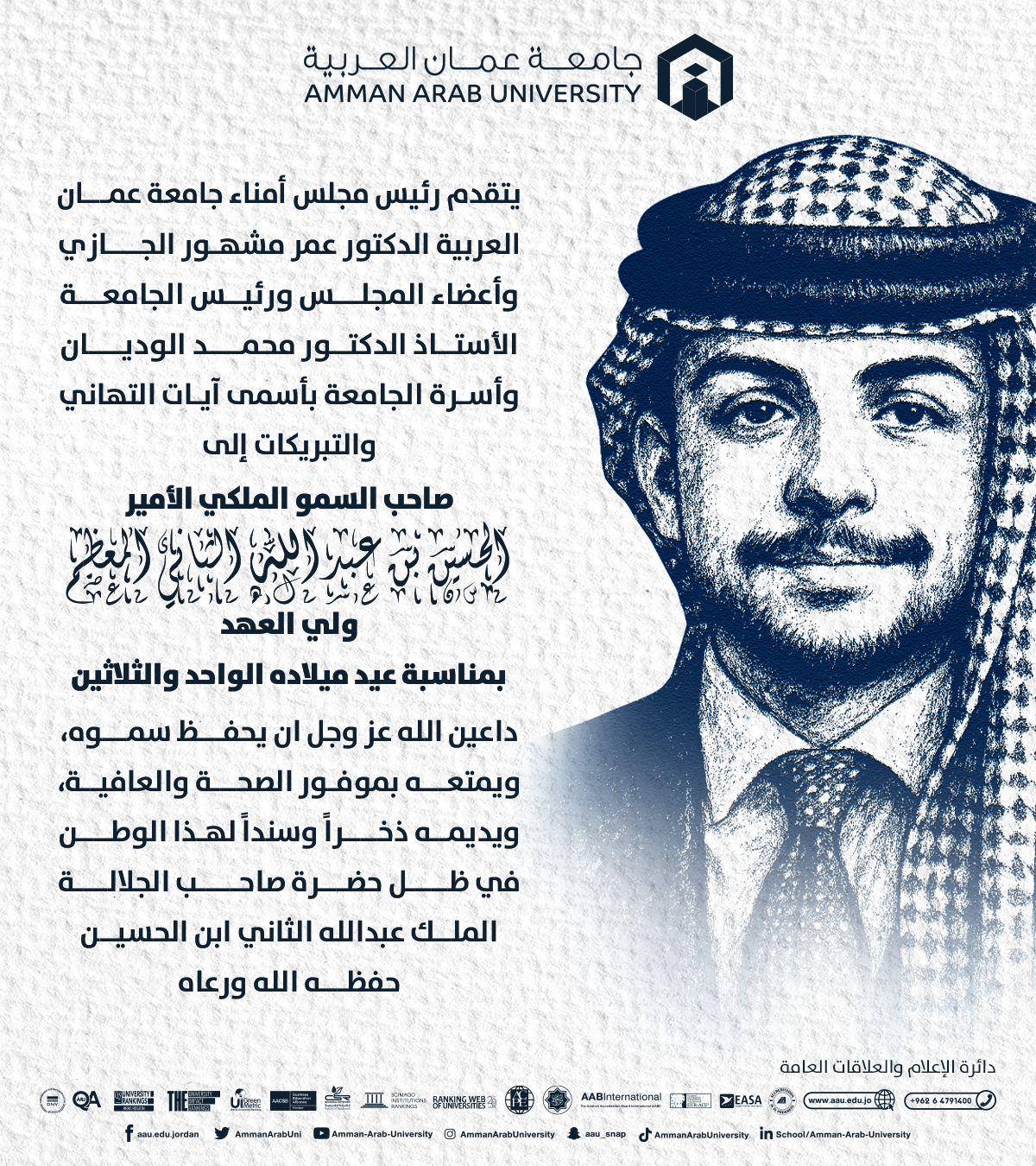 جامعة عمان العربية تهنئ ولي العهد بمناسبة عيد ميلاده