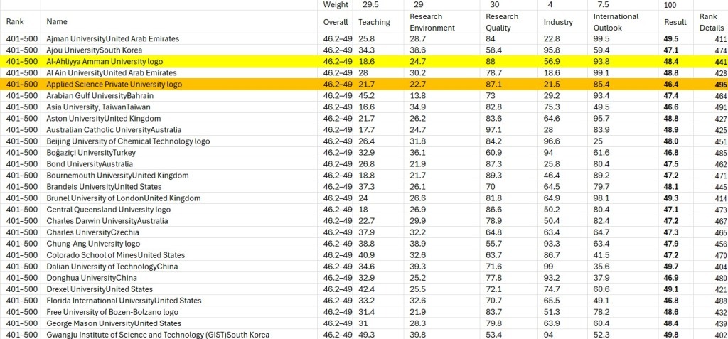 جدول تصنيف التايمز المرفق يظهر عمان الاهلية الأولى محلياً بلا منازع في المرتبة 441 ضمن الفئة 401 – 500 عالمياً