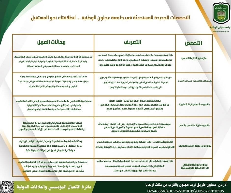جامعة عجلون الوطنية تعلن عن طرح تخصصات جديدة نوعية للطلبة