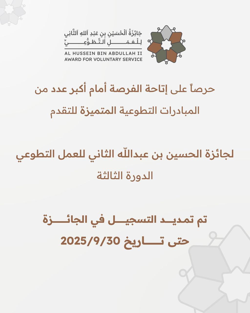 تمديد التسجيل في جائزة الحسين بن عبدالله للعمل التطوعي