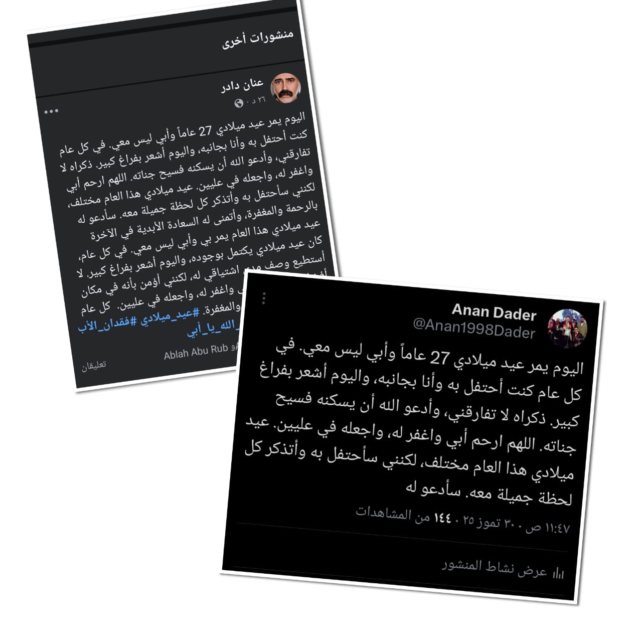 حزينا على والده .. عنان دادر يستقبل عامه الـ 27 بألم