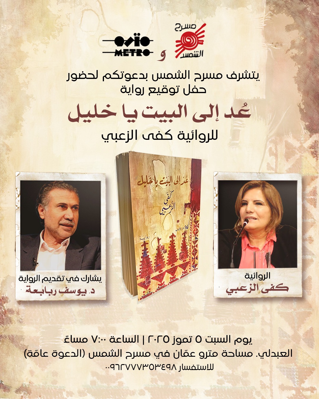 إشهار رواية"عد إلى البيت يا خليل" لكفى الزعبي السبت في مسرح الشمس