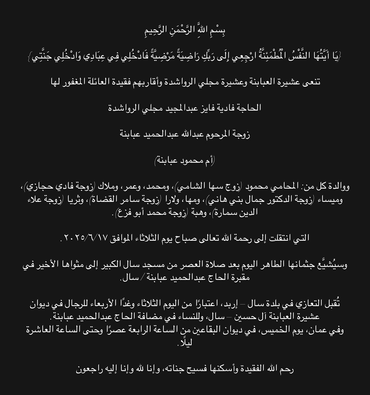وفيات الثلاثاء 17-6-2025
