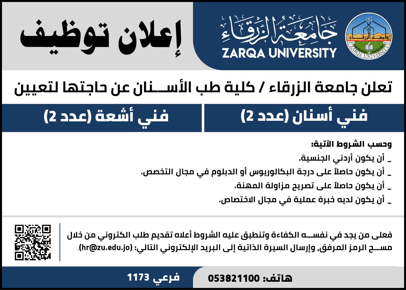جامعة الزرقاء بحاجة إلى تعيين فنيي أسنان وفنيي أشعة